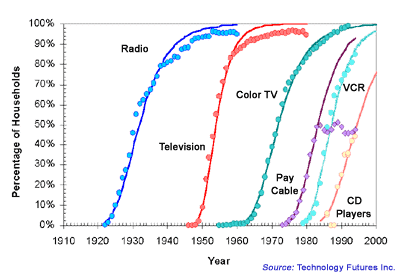 Some other consumer technologies spread as quickly and in a similar fashion. This chart from TFI is a useful reference for the diffusion of consumer communications technologies through the US market. We have added a version of broadband from our data on a similar scale.