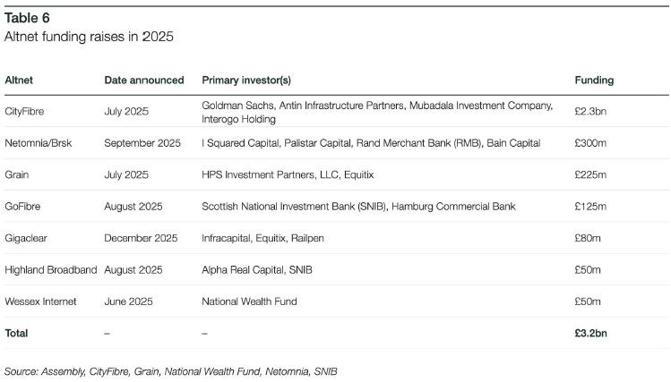 2025 saw six deals, including CityFibre’s acquisition of Hull-based Connexin. The mergers of FullFibre/Zzoomm and County Broadband/Truespeed were also significant, creating networks with over 600,000 and 177,000 premises passed, respectively.